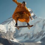 A skateboarder executing a perfect kickflip in mid-air, sunlight illuminating dust particles, gritty urban backdrop, detailed skateboard graphics, dynamic motion blur, hyperrealistic rendering, 8k resolution, cinematic lighting.